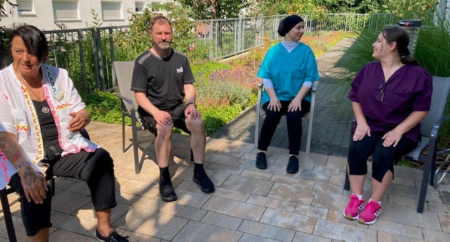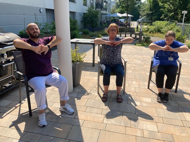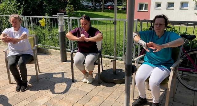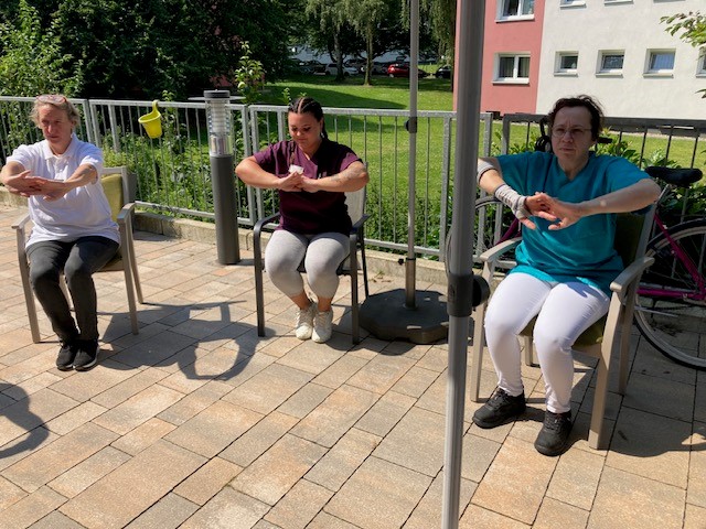 Seit dem 01.05.2024 ruft Frau Mommer-Glowa, unsere Einrichtungsleitung, täglich für eine viertel Stunde zum Mitarbeitersport auf. Alle Abteilungen sind herzlich eingeladen und nehmen begeistert teil!