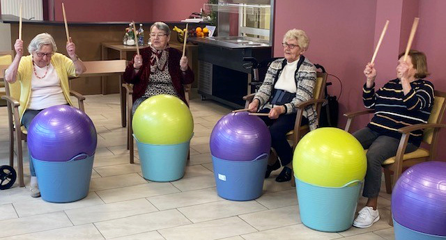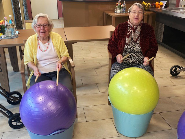 Wäschekorb und Gymnastikball finden in der Einrichtung am Beethovenweg einen ganz anderen Verwendungszweck: mit Trommelstöcken und viel Elan wurde bereits bei den ersten Versuchen taktgenau und von viel Heiterkeit begleitet, ordentlich getrommelt.