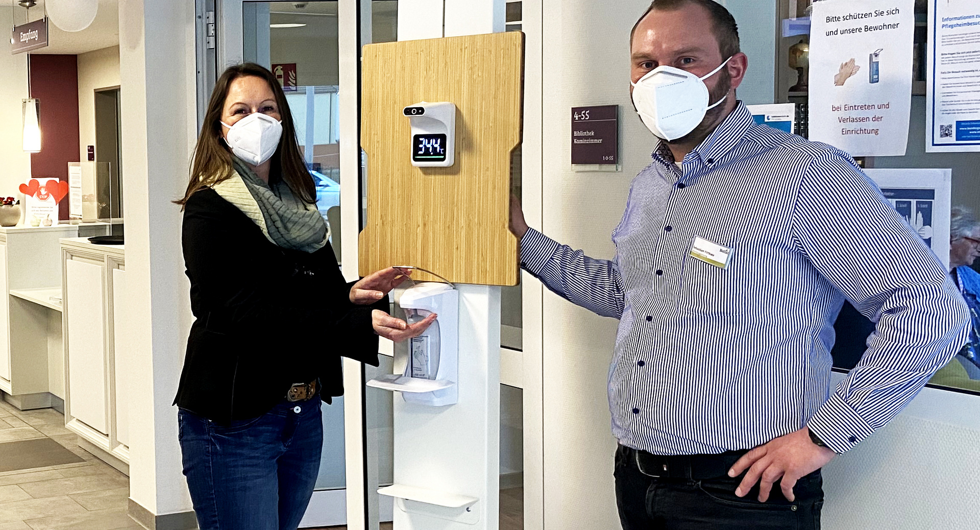 Seit wenigen Wochen stehen in den Eingangsbereichen der Belia Seniorenresidenzen als weiterer Bestandteil des Corona-Schutzkonzeptes sogenannte Hygiene Points – Ein Desinfektionsmittelspender mit integriertem Thermometer.