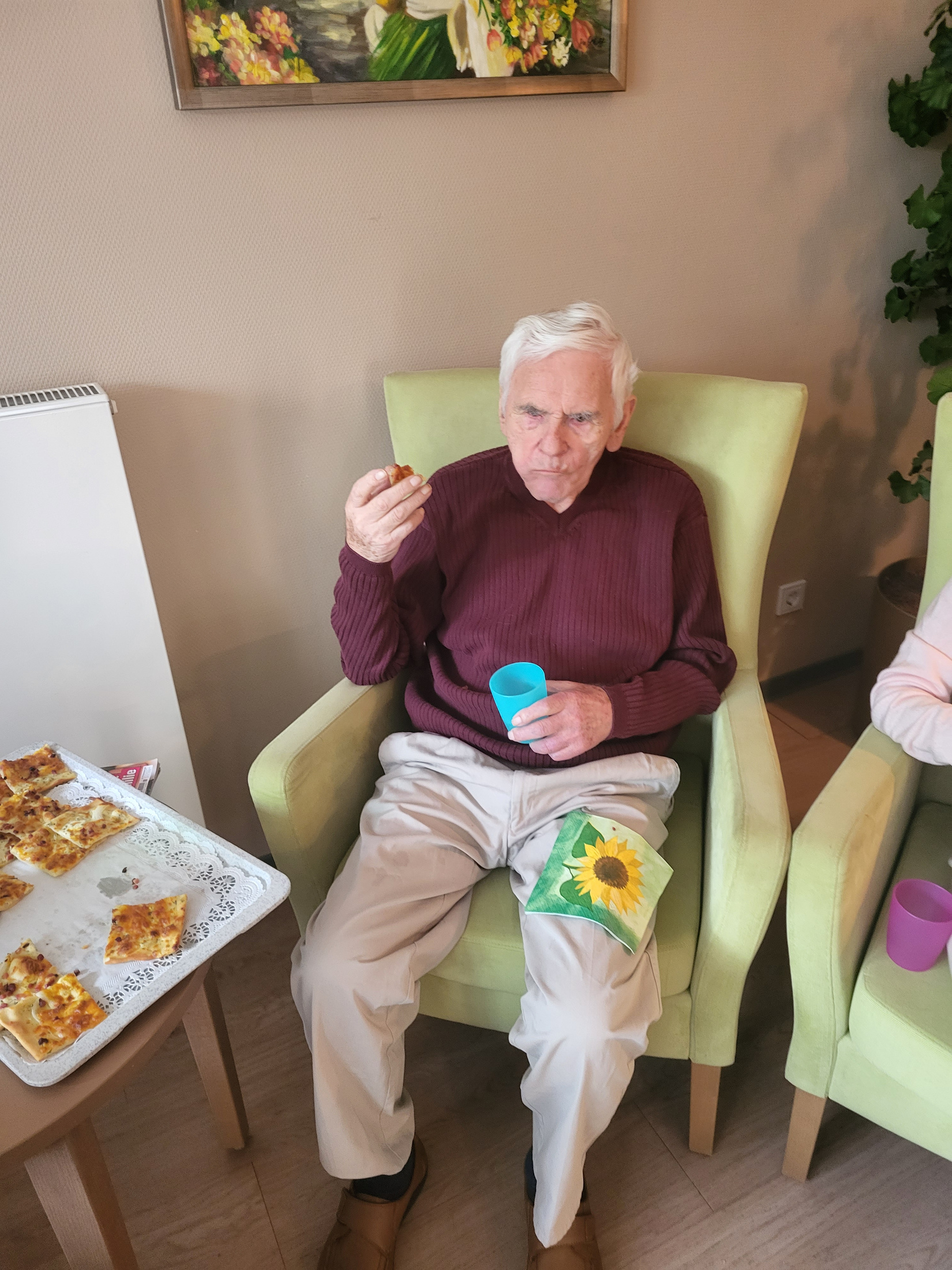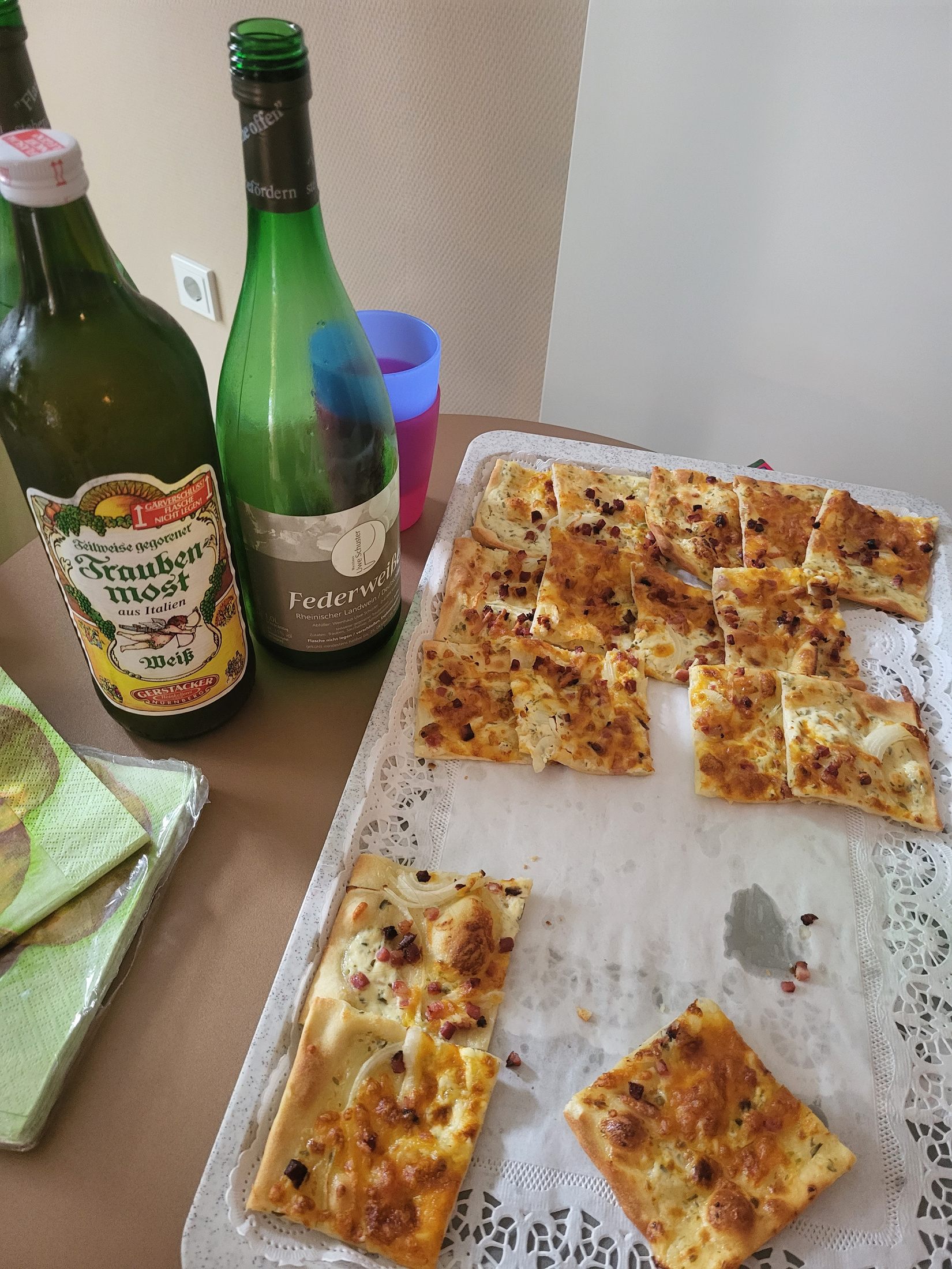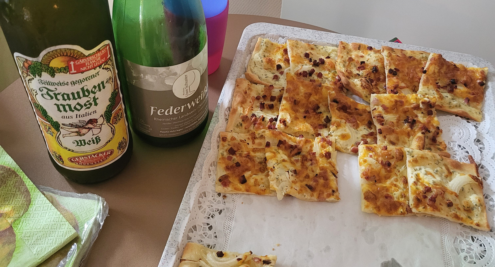 Es gab frisch gebackenen Elsässer Flammkuchen und Federweißer, und schnell kamen Gespräche über vergangene Urlaube an der Mosel oder die Weinlese am Rhein in Gang. Wer wollte, konnte Erinnerungen austauschen oder einfach den Nachmittag in entspannter Runde genießen.