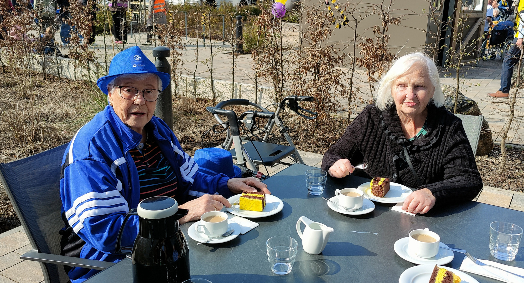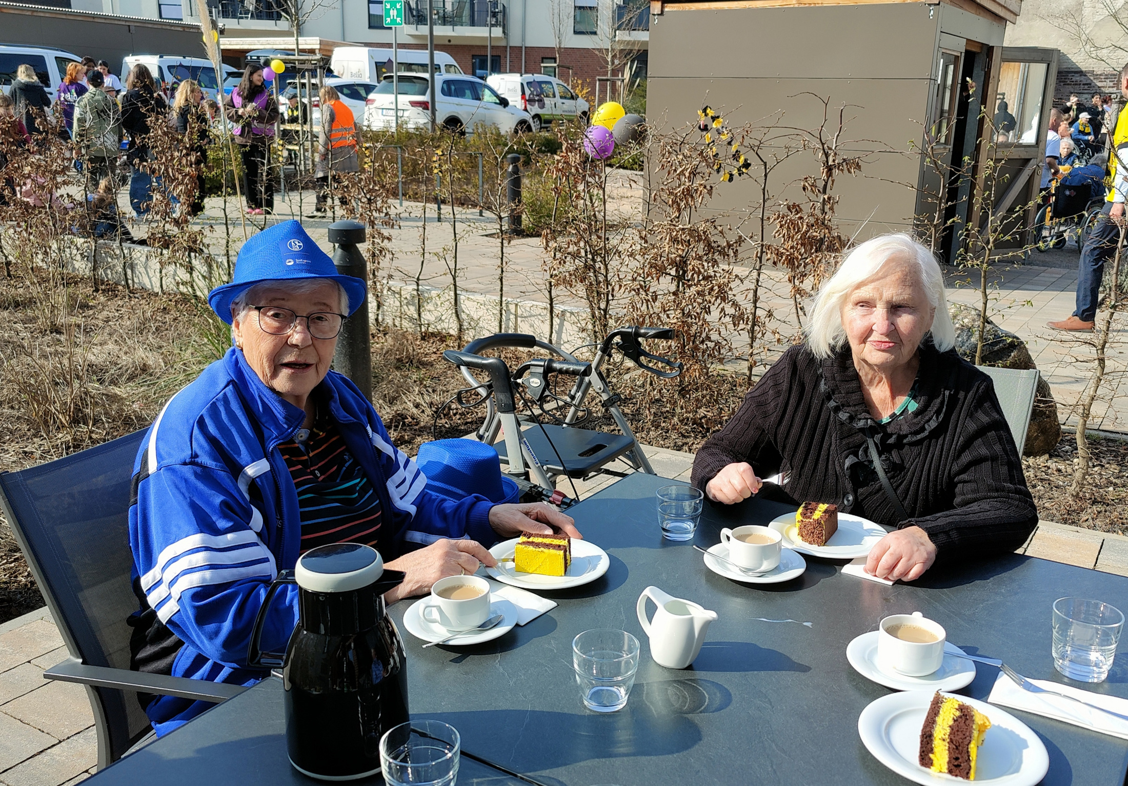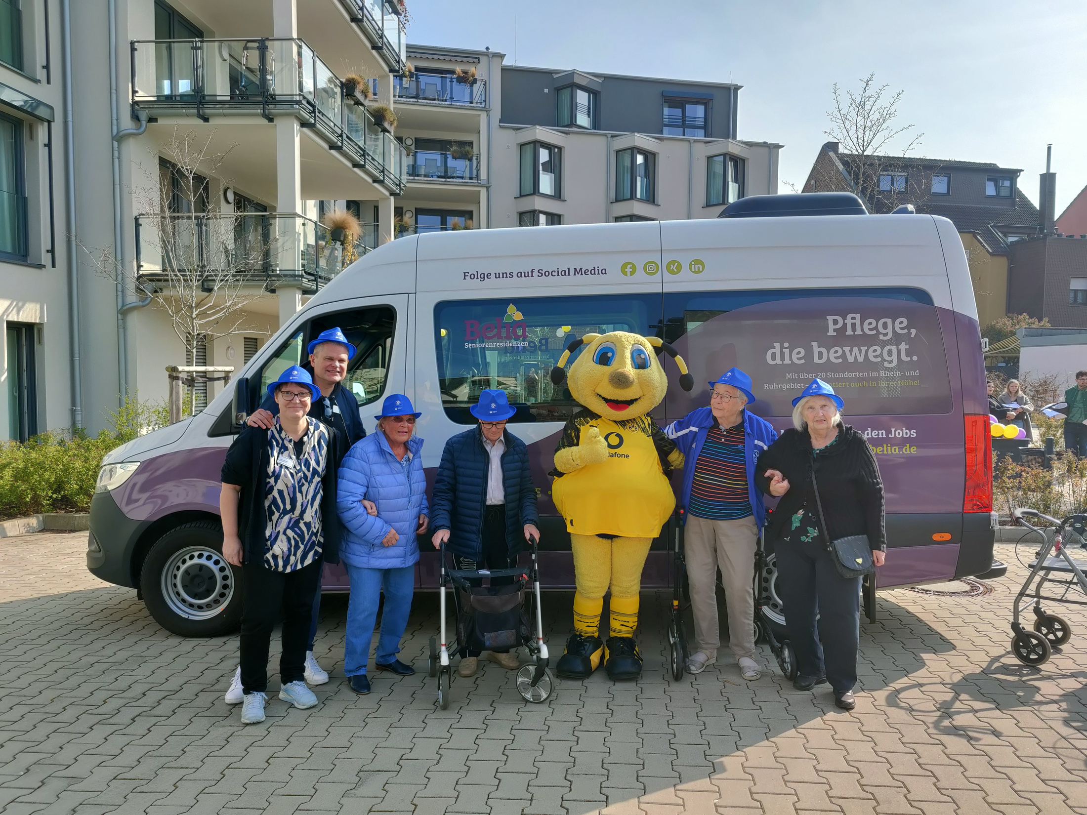 Zu Beginn bemerkte eine unserer Bewohnerinnen, Frau Offergeld, mit einem kleinen Schmunzeln: „Da können wir doch nicht hin, wir sind echte Schalker und wollen mit Dortmund nichts zu tun haben!“ Doch wie umgehen mit der Rivalität zwischen Schalke und Dortmund? Ganz einfach: unsere Bewohnerinnen und Bewohner zogen sich in „blau-weiß“ an und versprachen, gemeinsam ein Foto mit dem BVB-Maskottchen zu machen.
