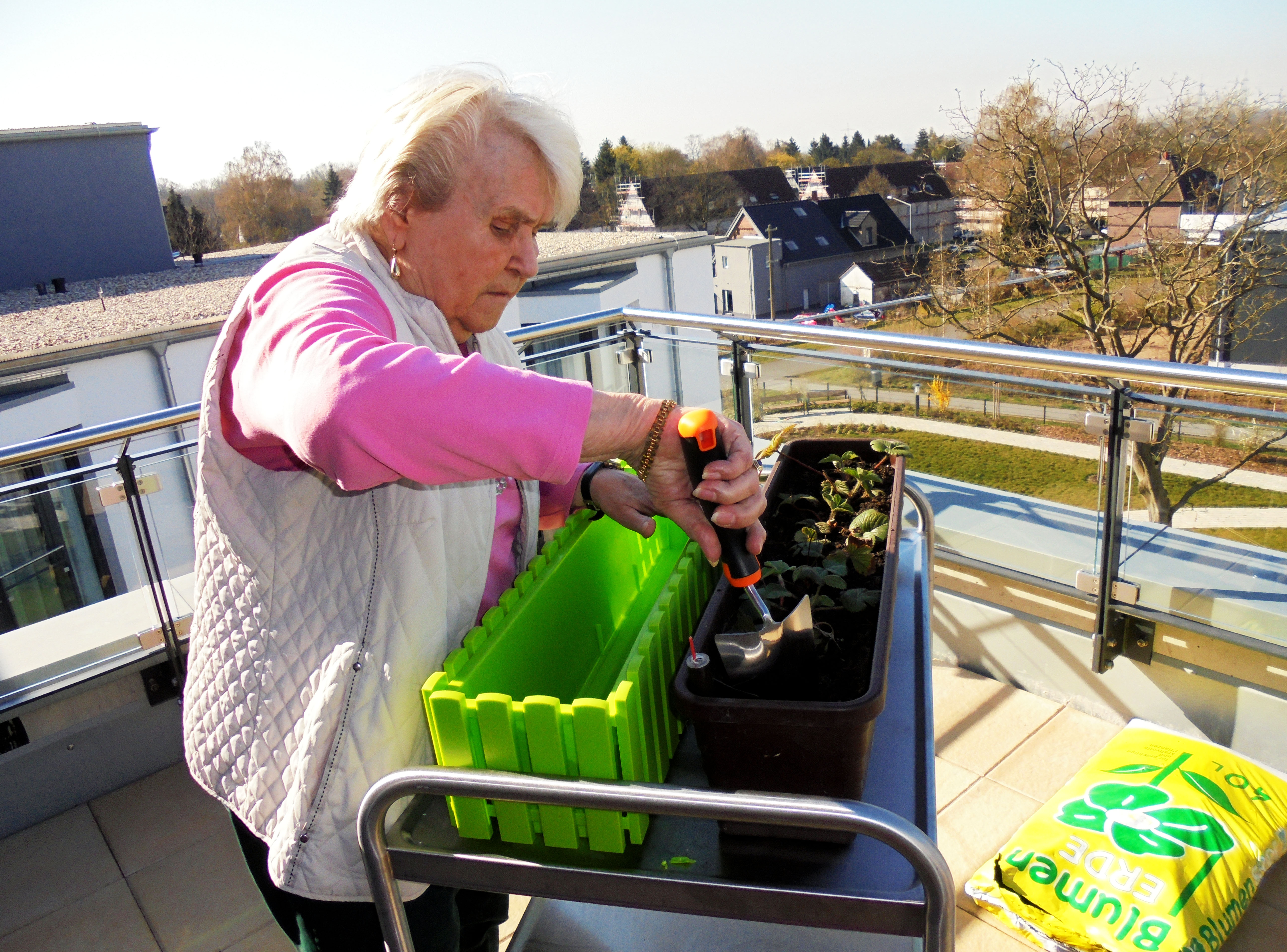 Jetzt war es für die Bewohner an der Zeit die Keimlinge in die vorgesehenen Blumenkästen umzupflanzen. Routiniert wurde die Geduld bewahrt und sogar der ein oder andere grüne Daumen kam zum Vorschein.