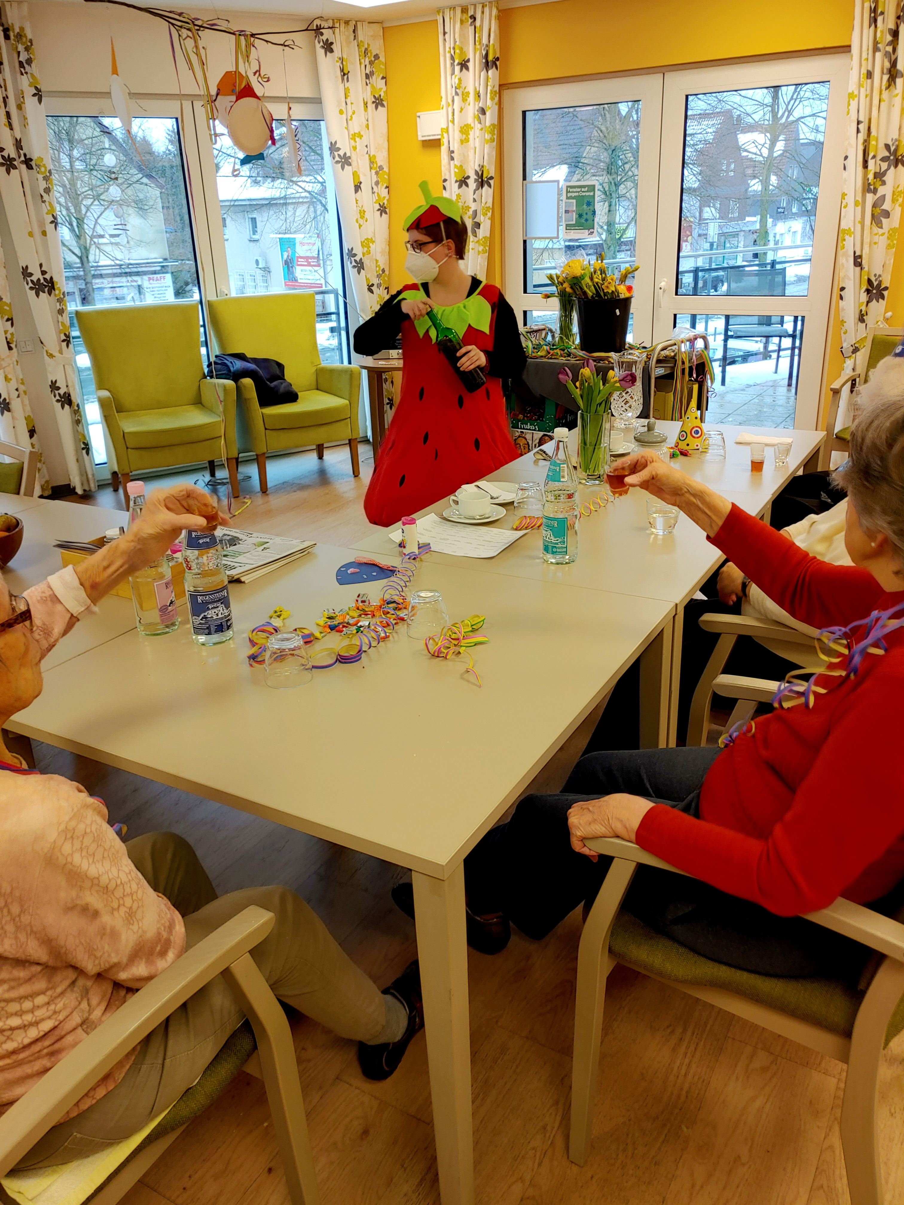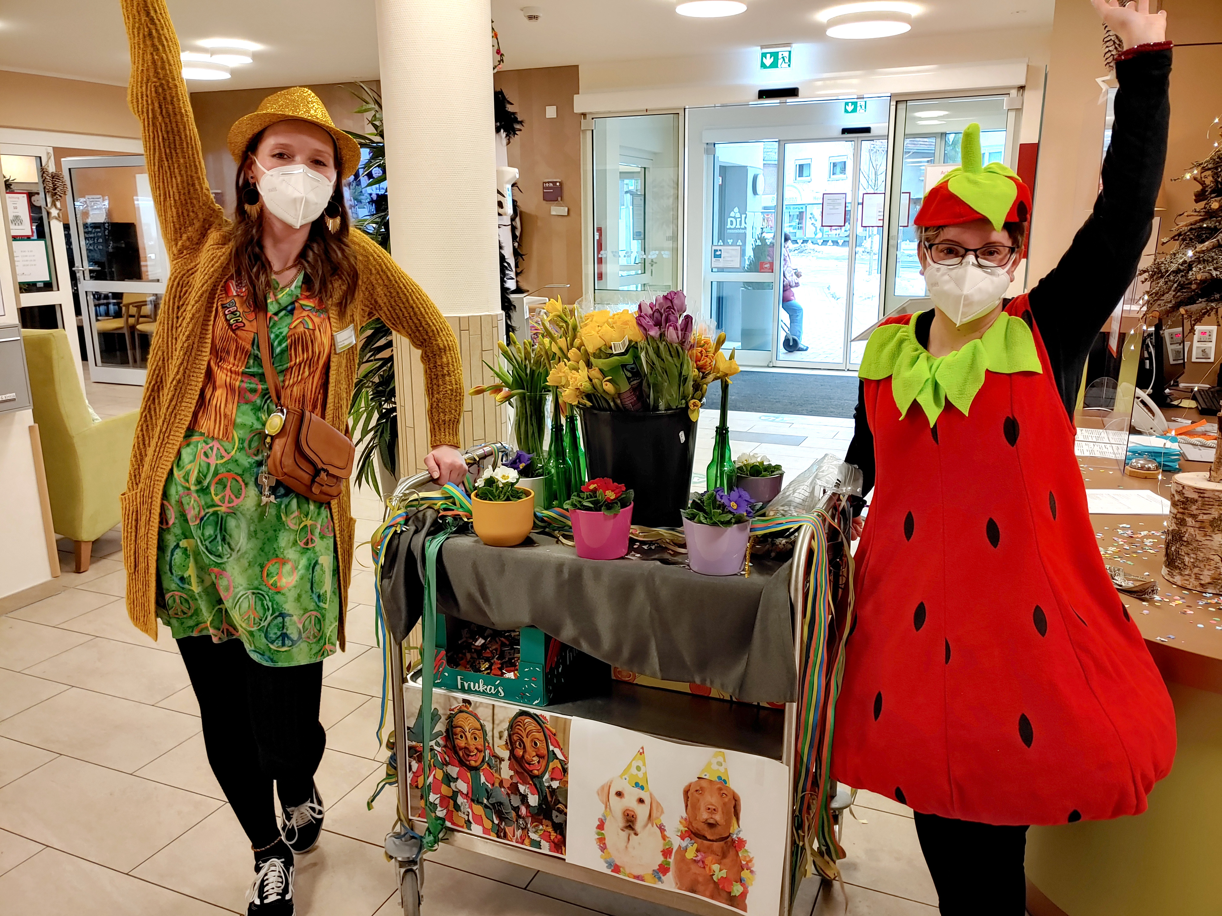 Auch Karneval, insbesondere Rosenmontag, haben wir uns nicht nehmen lassen! Am Morgen wurden bereits Karnevalslieder gesungen und am Nachmittag zogen die MitarbeiterInne mit einem Karnevalswagen über die Flure und beglückten unsere BewohnerInnen mit leckeren Bonbons, bunten Blumen und ganz viel Konfetti.
