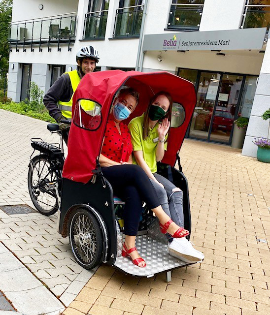 Das Projekt bietet ehrenamtliche Rikscha-Fahrten mit Bewohnern von Alters- und Pflegeheimeinrichtungen an. Auf einer ein- bis zweistündigen Fahrt können unsere Bewohner ihren Heimatort Marl neu entdecken, in Erinnerungen schwelgen oder einfach die Zeit an der frischen Luft genießen. Besonders für die nicht mehr so mobilen Bewohner ist das Projekt eine schöne Abwechslung. Mit einer angepassten Geschwindigkeit von etwa zwölf km/h werden die Touren für bis zu neun Bewohner ein echtes Erlebnis. Unsere Mitarbeiter durften schon eine kleine Proberunde auf dem Gelände der Seniorenresidenz drehen und hatten sichtlich Spaß.