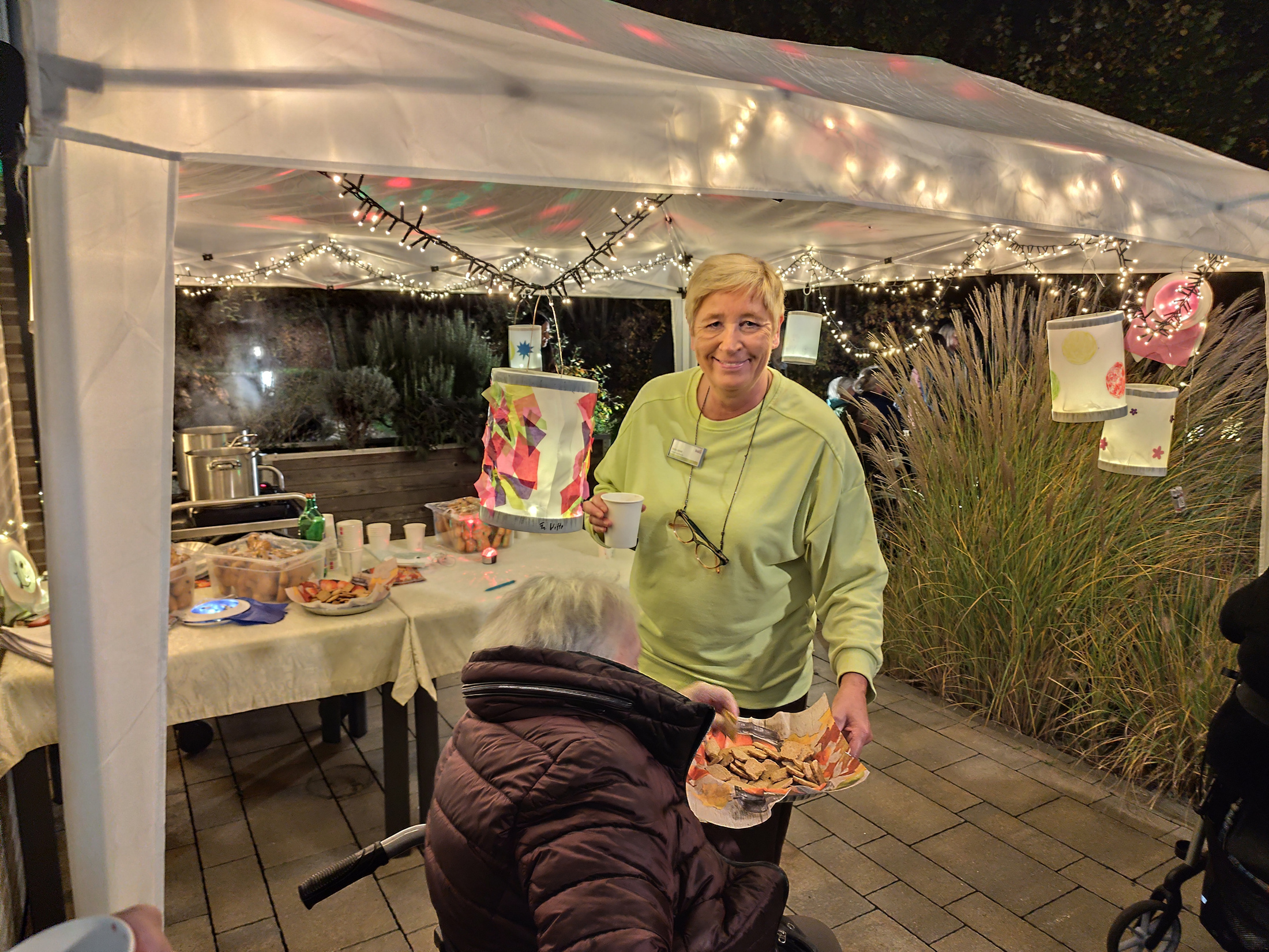 Der Betreuende Soziale Dienst hatte eigens einen gemütlichen Pavillon vorbereitet, der mit hellen Laternen und einer warm leuchtenden Lichterkette geschmückt war. Passend zum Anlass wurden Glühwein, Weckmänner und Plätzchen gereicht, die von unseren Bewohnerinnen und Bewohnern sowie Gästen gerne angenommen wurden.