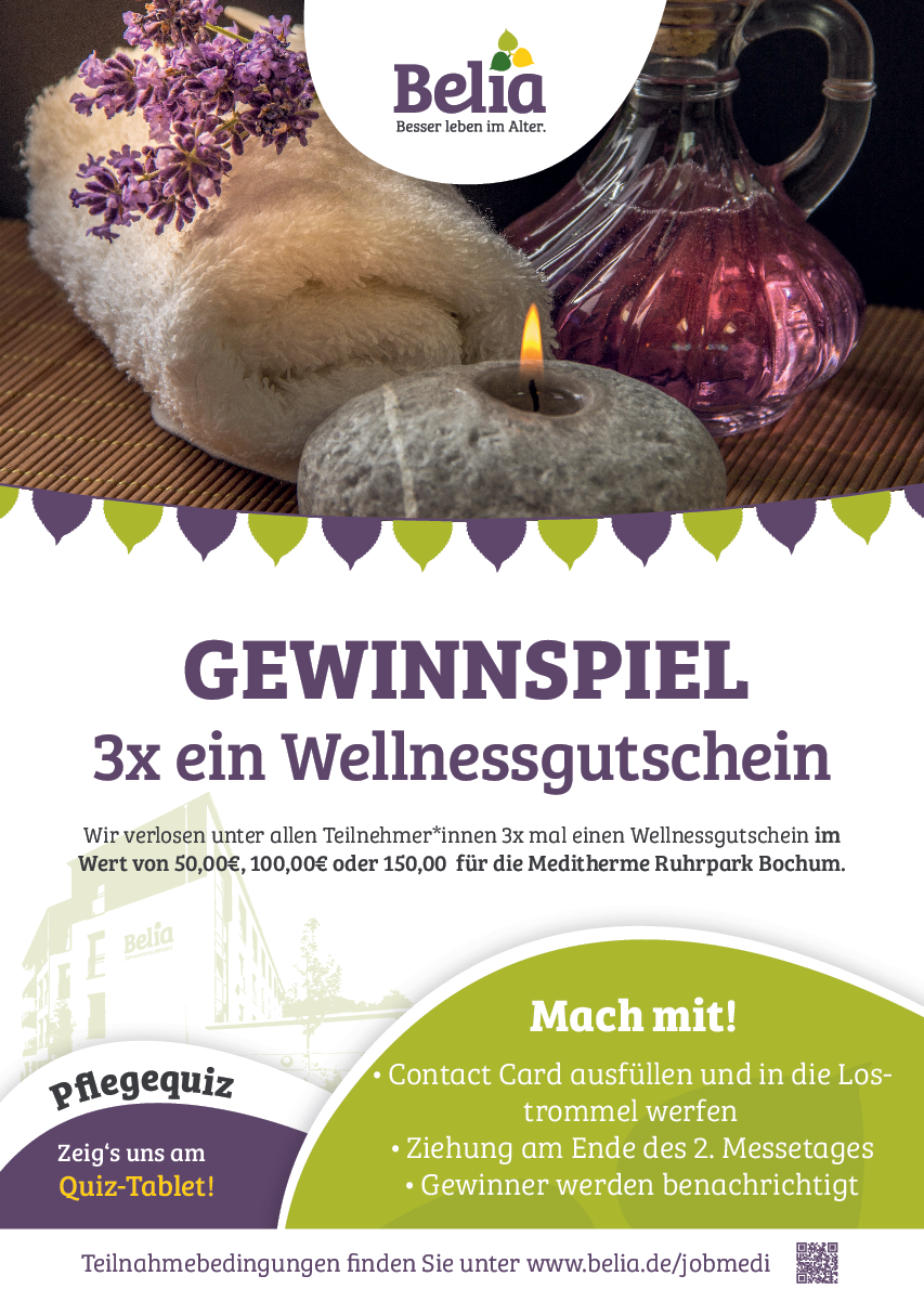 Wir sprechen gemeinsam über Pflege von morgen und was bei Belia bereits heute dafür getan wird. Beweise umfassendes Fachwissen im Pflegequiz und am Gewinnspiel teil. Die Gewinner können sich über Wellnessgutscheine für Meditherme Ruhrpark in Bochum freuen.