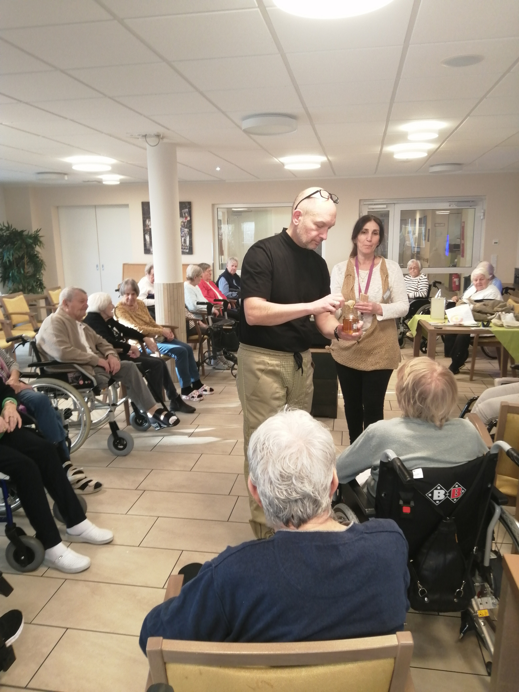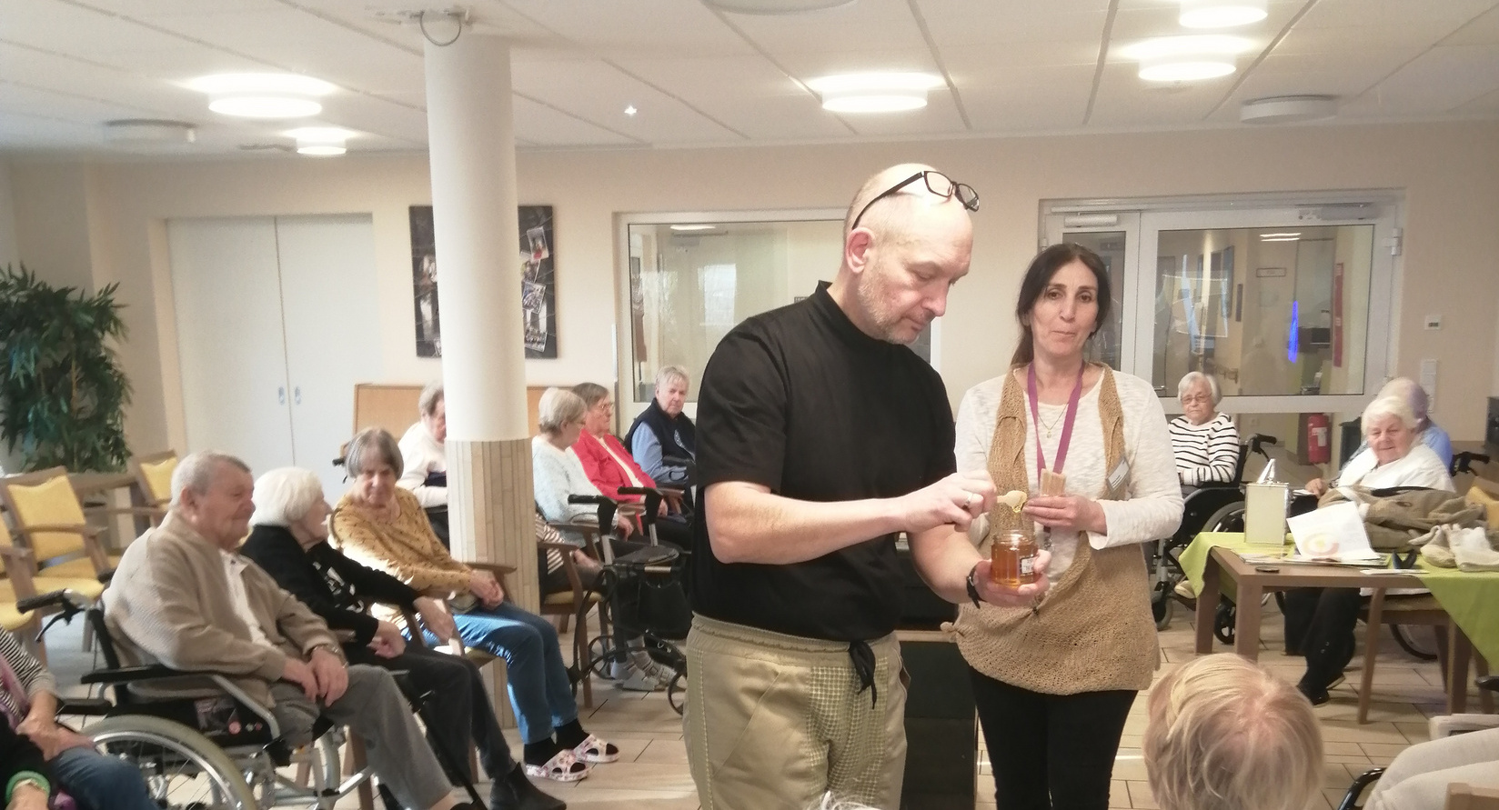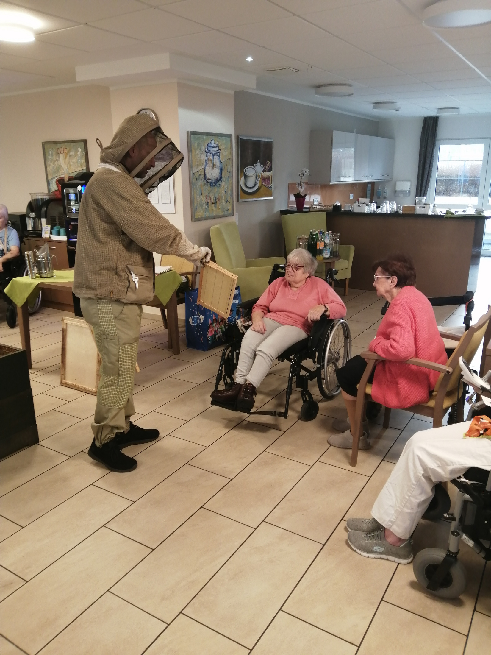Herr Gottschalk erschien in vollständiger Imkermontur und brachte neben seinem Fachwissen auch leckeren Honig zum Probieren mit. Außerdem konnten die BewohnerInnen die Bienenkästen, in denen die Bienen leben, aus nächster Nähe bestaunen.