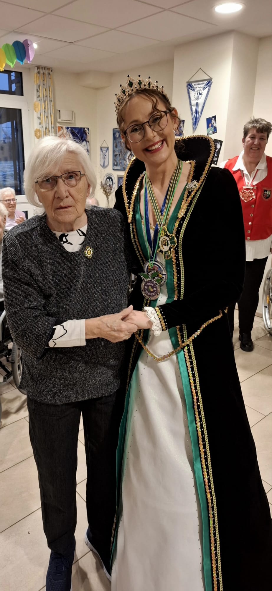 Ein besonders schöner Moment war die Übergabe des Belia Ordens: Unsere Bewohnerin Frau Schulze überreichte diesen an Prinzessin Stephanie I., die sichtlich gerührt war. Als Zeichen der Anerkennung erhielt Frau Schulze im Gegenzug einen Orden-Anstecker, den sie stolz an ihrem Pullover trug.