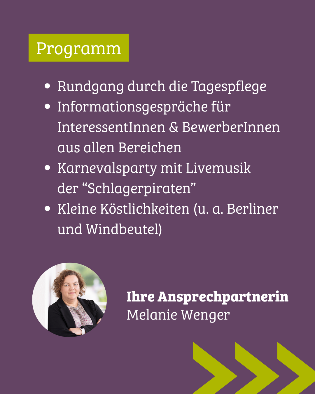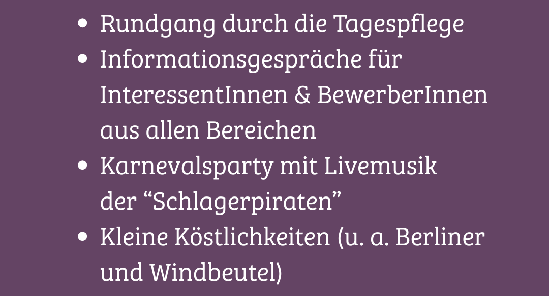 Das interessiert die Nachbarschaft, die SeniorInnen des Stadtteils und Job-Suchende natürlich sehr – sie alle sind herzlich zum Tag der offenen Tür eingeladen. Am Freitag, dem 13. Februar öffnet die Belia Tagespflege Kapellen ihre Türen und heißt ihre BesucherInnen zu einem karnevalistischen Nachmittag willkommen. Rundgänge und ein Kennenlernen der Führungs- und Pflegekräfte stehen auf dem Programm – und außerdem eine kleine Karnevalsparty mit Livemusik der Schlagerpiraten und kulinarischen Faschings-Spezialitäten.