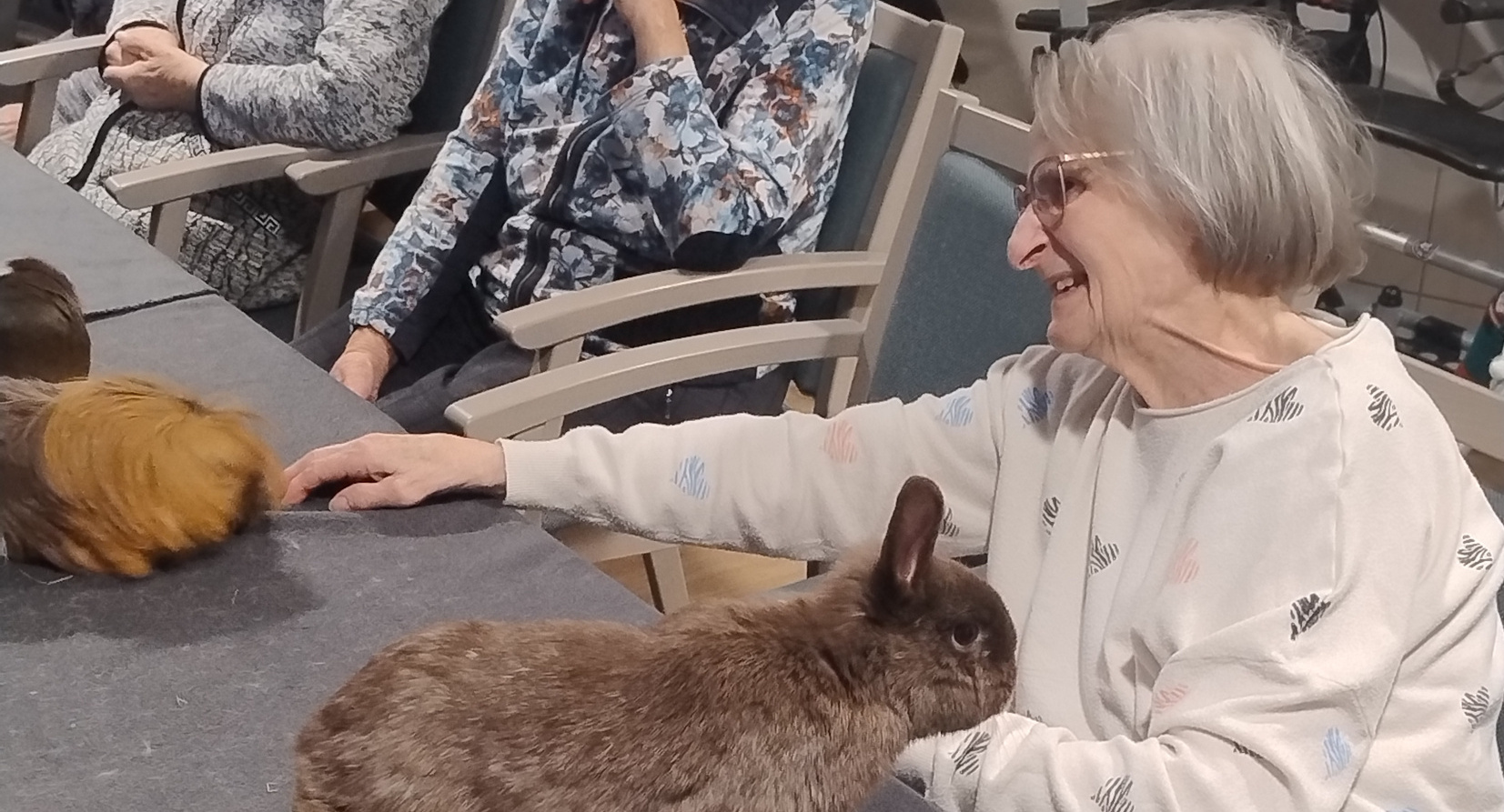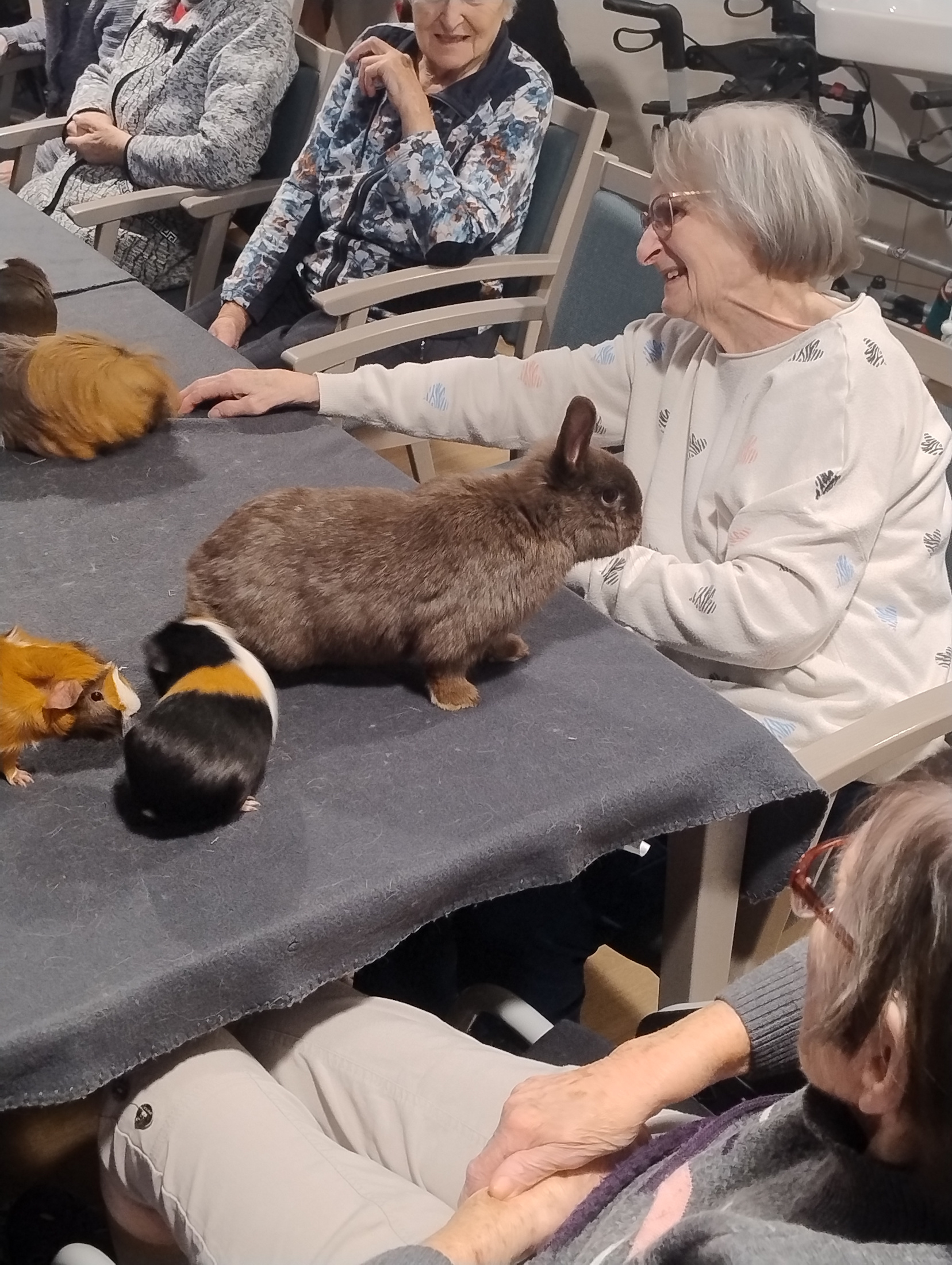 Bereits bei der Ankunft der Tiere war das Interesse groß. Der Therapiehund überzeugte durch seine ruhige und freundliche Art und lud zum Streicheln ein. Auch Hase Harry sowie die weiteren Kleintiere wurden aufmerksam beobachtet und mit großer Freude wahrgenommen. Für viele Bewohnerinnen und Bewohner weckte der Kontakt mit den Tieren Erinnerungen an frühere Lebensabschnitte, was zu anregenden Gesprächen und einem lebendigen Miteinander führte.