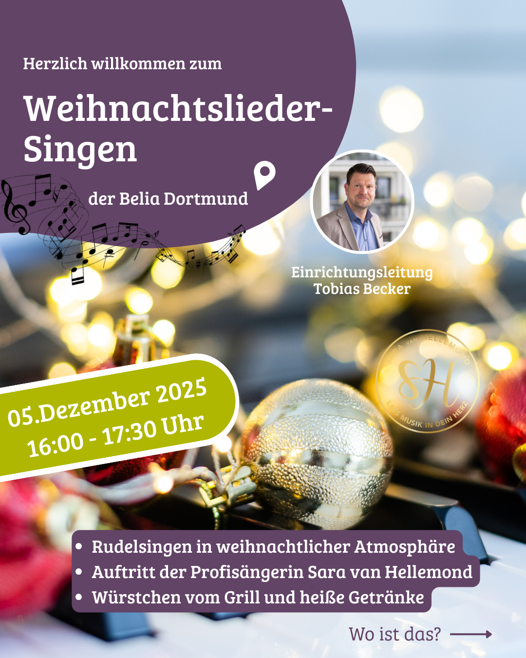 Weil´s so schön ist, lädt die Belia Seniorenresidenz Dortmund alle BewohnerInnen, Angehörige und NachbarInnen am Freitag, dem 5. Dezember ab 16 Uhr herzlich dazu ein, gemeinsam Weihnachtslieder zu singen.