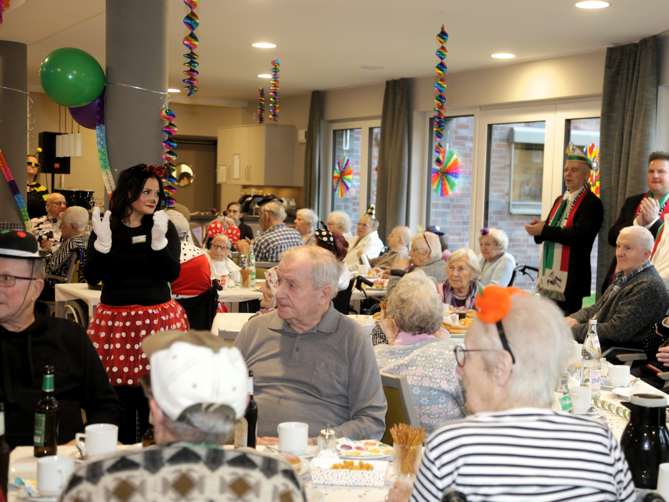 Der Gemeinschaftsraum war passend zum Anlass mit Luftschlangen, Girlanden und farbenfroher Dekoration geschmückt und sorgte bereits am Vormittag für karnevalistische Stimmung. Viele Teilnehmende beteiligten sich mit Kostümen, Hüten oder Masken und trugen so zu einer heiteren und lebendigen Atmosphäre bei.