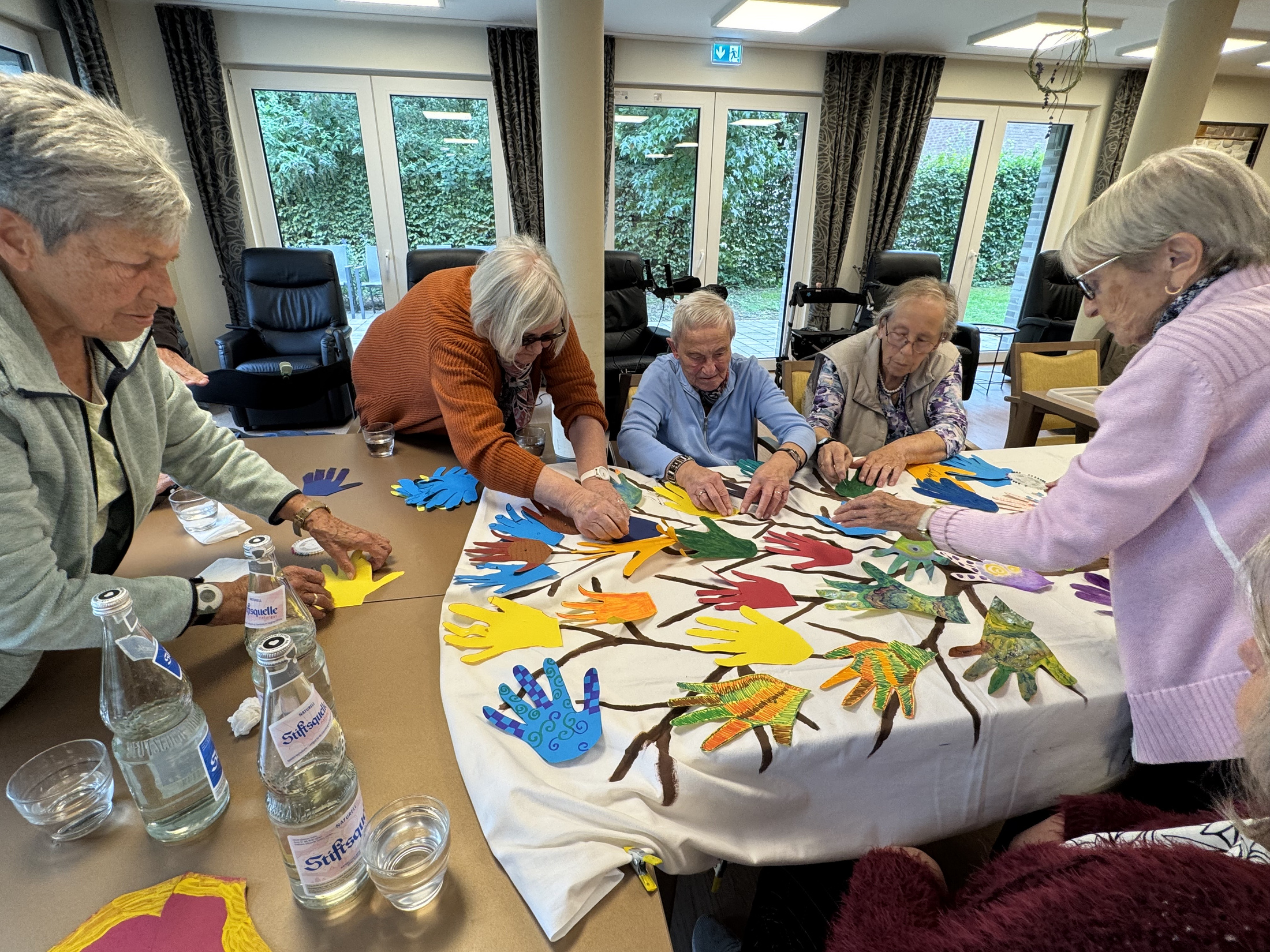 Alle halten zusammen, alle arbeiten zusammen, alle schaffen etwas zusammen. So lässt sich das Motto der kreativen Woche unserer Gäste umschreiben. Der Gemeinschaftsbaum war ein Projekt, zu dem jeder etwas beitragen konnte. Jede Hand, jedes Bild zusammen ergibt unseren Gemeinschaftsbaum als Symbol unserer starken Gemeinschaft. Zwei Meter groß ist der Holzbaum, dessen Blätter sich aus vielen Händen zusammensetzen – ein Baum, dessen Wurzeln stärker und dessen Krone reicher wird, je mehr Blätter er tragen darf.