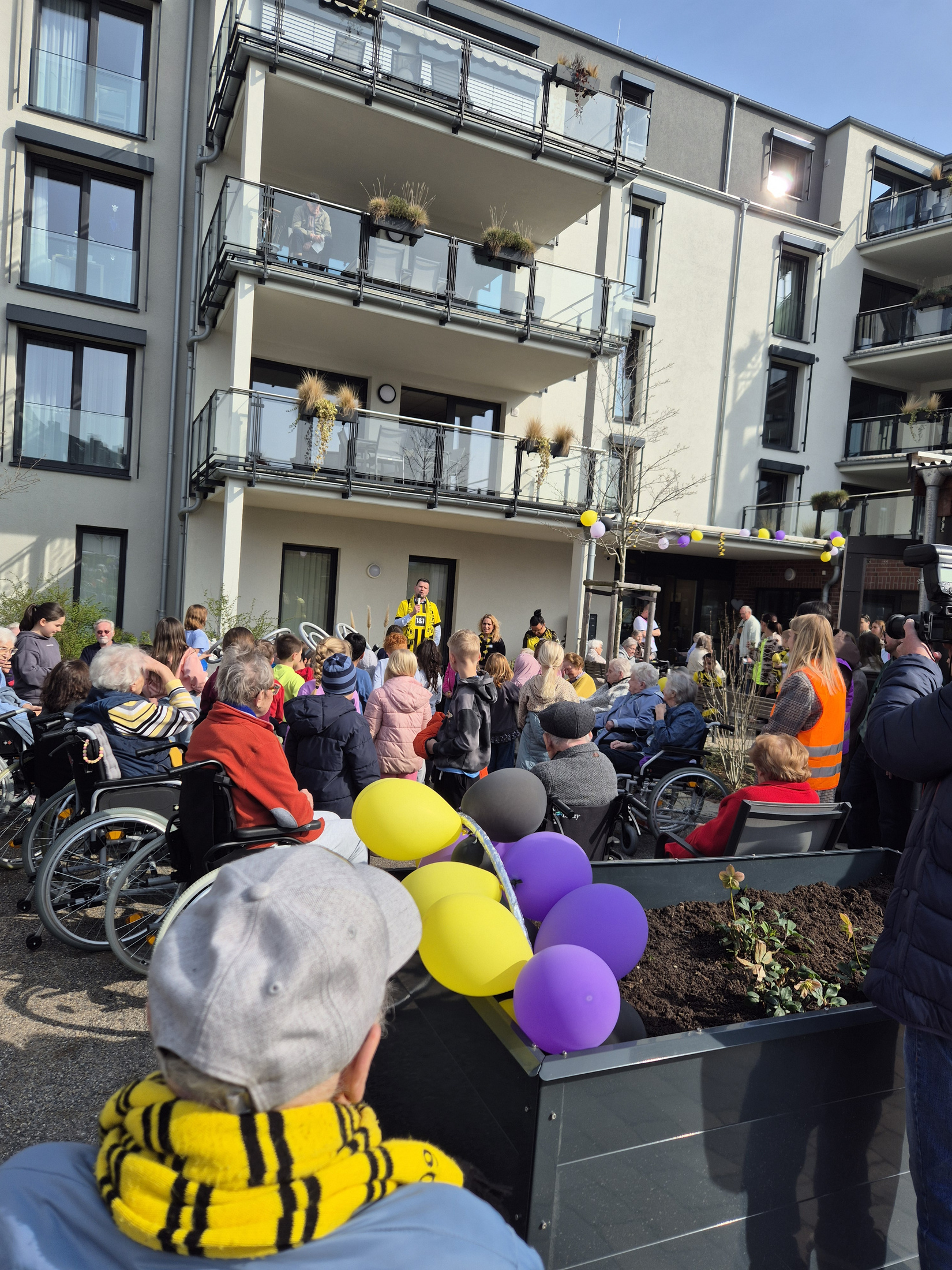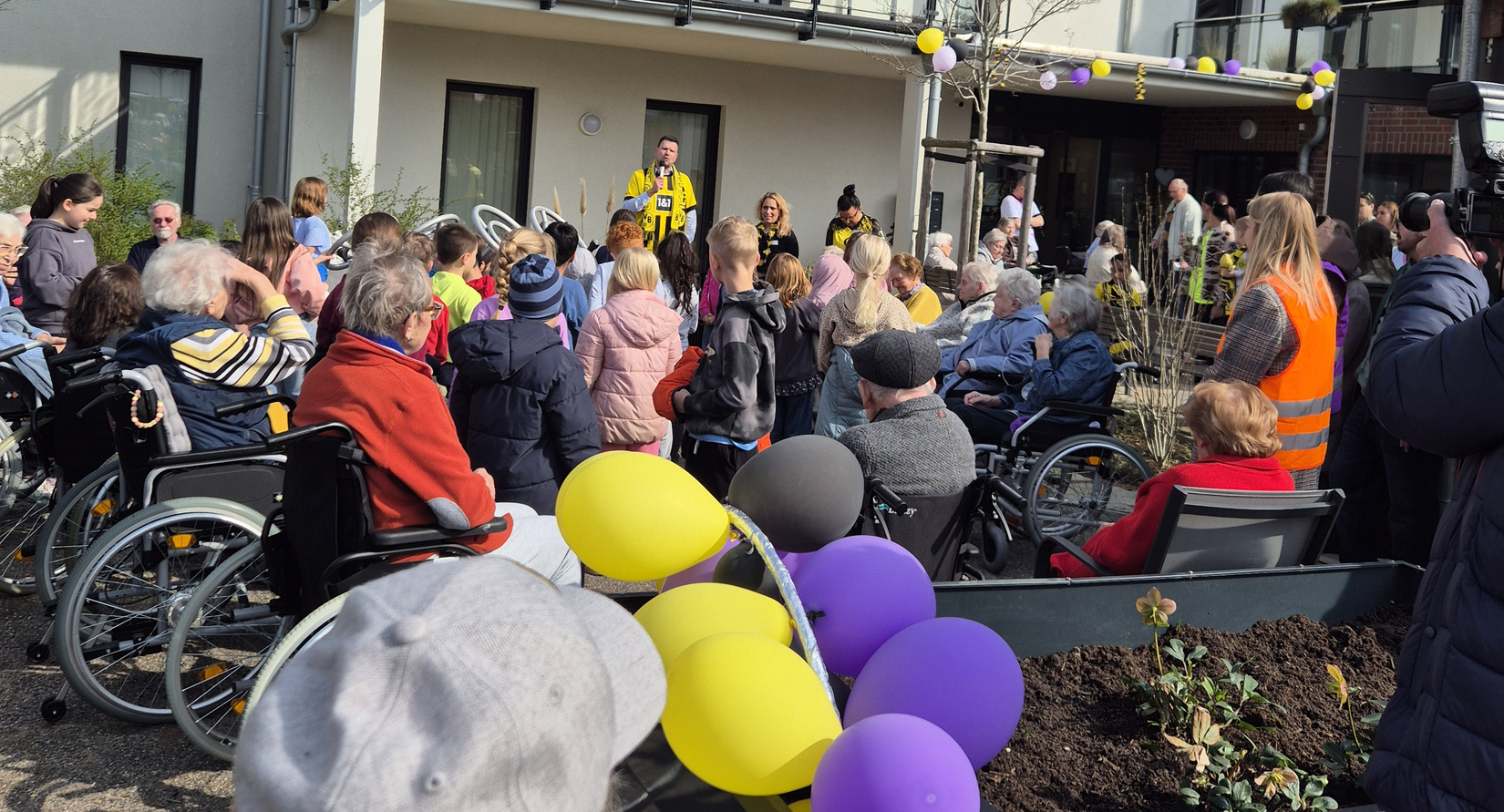 Nicht nur die Belia Seniorenresidenz Schalke war zum Auftakt der Pflanzaktion in Dortmund zu Gast, sondern auch vier weitere Belia Häuser, die mit Bussen angereist sind. Geladene Gäste waren außerdem die Schragmüller Grundschule sowie die Regenbogen Grundschule aus Mengede, die beide auch Kooperationspartner der Belia Dortmund sind. Insgesamt begrüßte die Seniorenresidenz rund 200 Gäste und bewirtete sie mit einem phantastischen, selbstgebacken schwarz-gelben Kuchen und heißen und kalten Getränken.