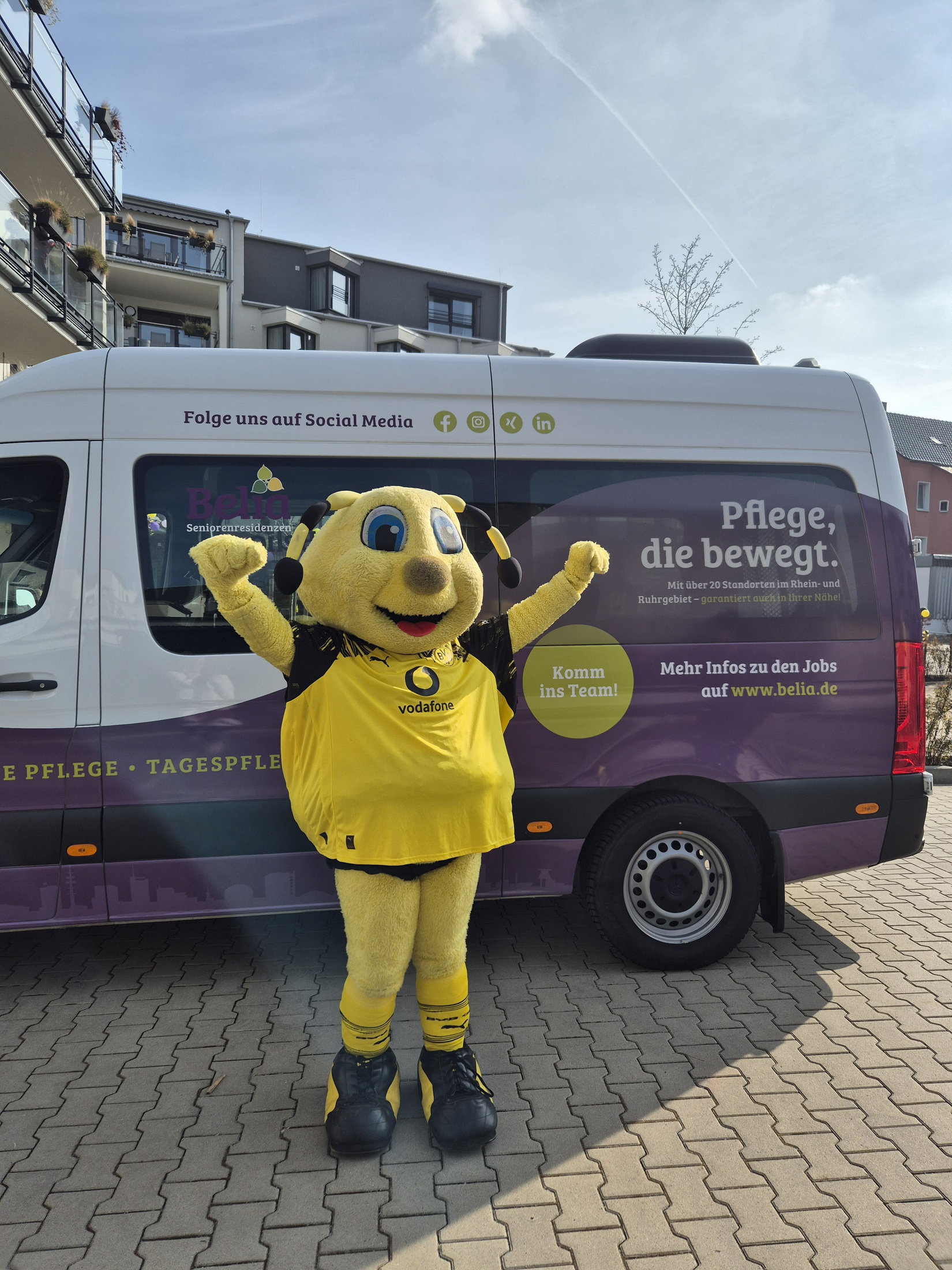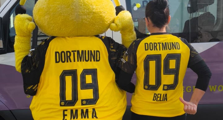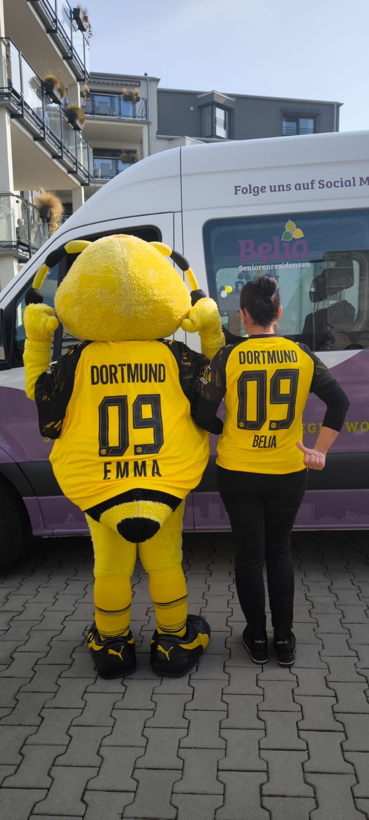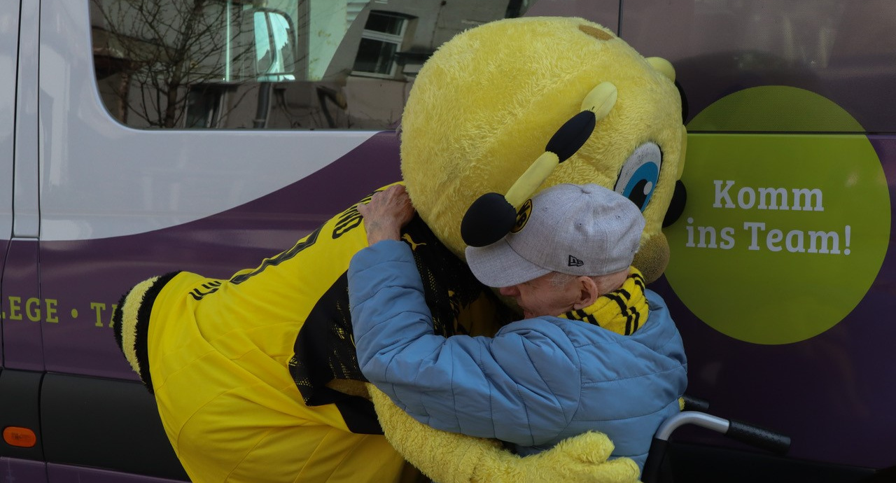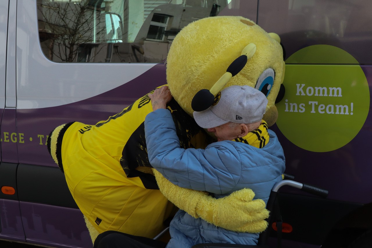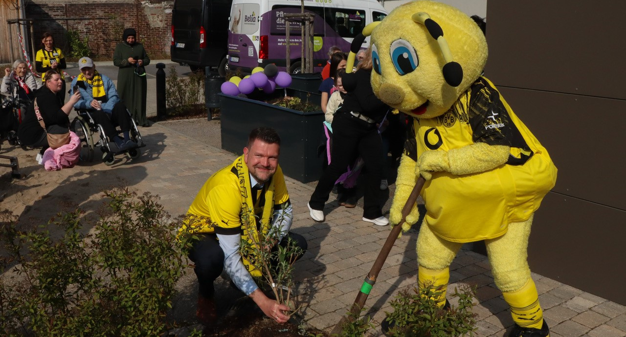 Denn: Egal, was man in Dortmund tut, der BVB ist immer dabei! Zum Start der Mengeder Pflanzaktion entsandte der Verein Emma, das schwarz-gelbe Bienen-Maskottchen. Emma dufte die erste Blume setzen und posierte für Fotos. Einem Bewohner – einem eingefleischten BVB-Fan! – gab sie ein Autogramm auf seine Kappe – und da war kein Halten mehr. Die beiden lagen sich in den Armen, sangen BVB-Schlachtgesänge und freuten sich so sehr, dass Tränen flossen.