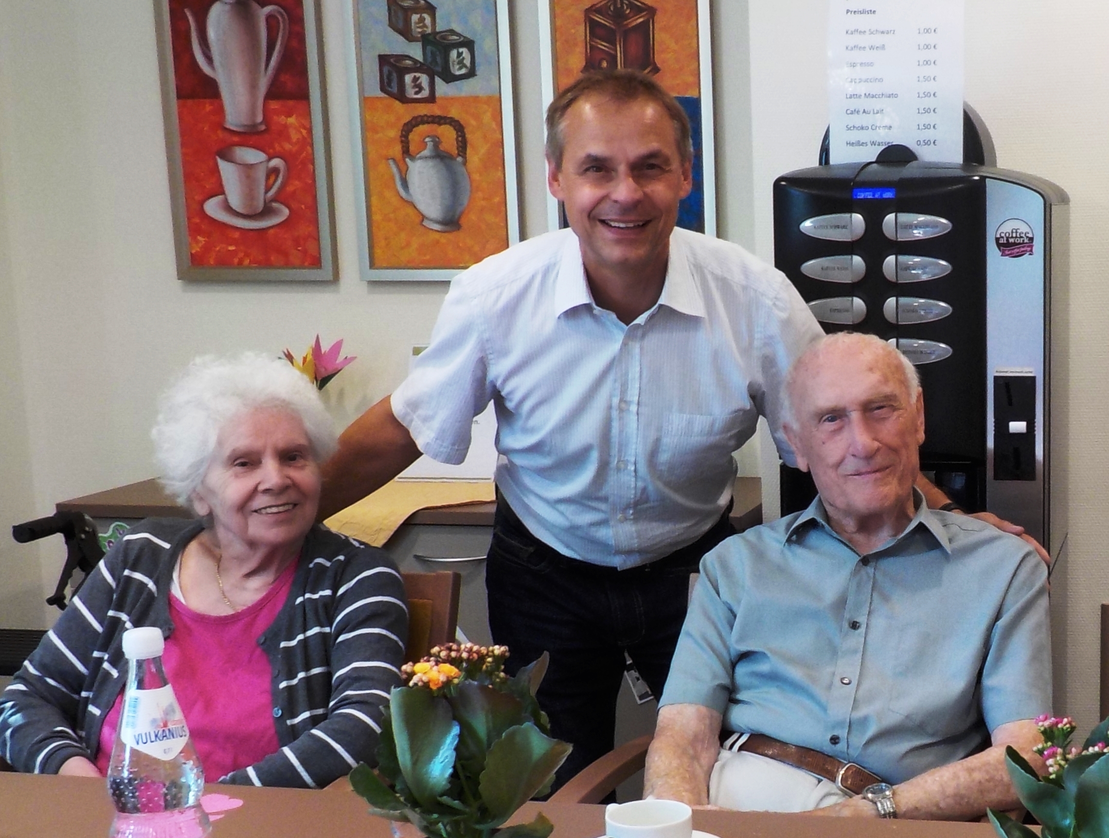 Zunächst gesellte sich Olaf Thon zu der gemütlichen Kaffeerunde, und nachdem sich alle gestärkt hatten, erzählte er von sich, seiner Familie, seiner Fußballkarriere bei den Königsblauen und bei den Bayern. Die Bewohner lauschten sehr genau den Geschichten über die prägende Zusammenarbeit mit Rudi Assauer beim S04 und Uli Hoeneß beim FC Bayern. Thon verriet außerdem seine Leidenschaft zum Kochen und ließ er sich sogar die Zubereitung von „Ossobuco“ (trad. Italienisches Schmorgericht) entlocken, welche er vermutlich während seines Titelgewinns mit der deutschen Nationalmannschaft 1990 in Italien aufschnappte. Besonders überrascht waren unsere Bewohner über die Tatsache, dass unser Eurofighter auch politisch aktiv ist.